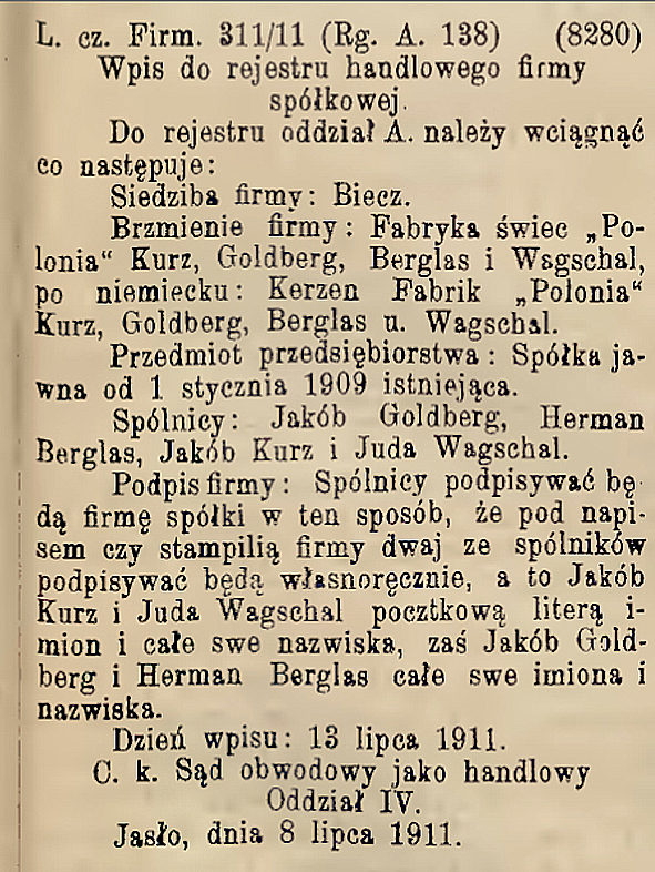 ŚWIECE. FABRYKA ŚWIEC "POLONIA". WŁAŚCICIELE: JAKUB KURZ, JAKUB GOLDBERG, HERMAN BERGLAS, JUDA WAGSCHAL