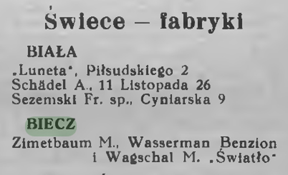 ŚWIECE. FABRYKA ŚWIEC "ŚWIATŁO". WŁAŚCICIELE: MOJŻESZ ZIMETBAUM, BENZION WASSERMAN, MARKUS WAGSCHAL
